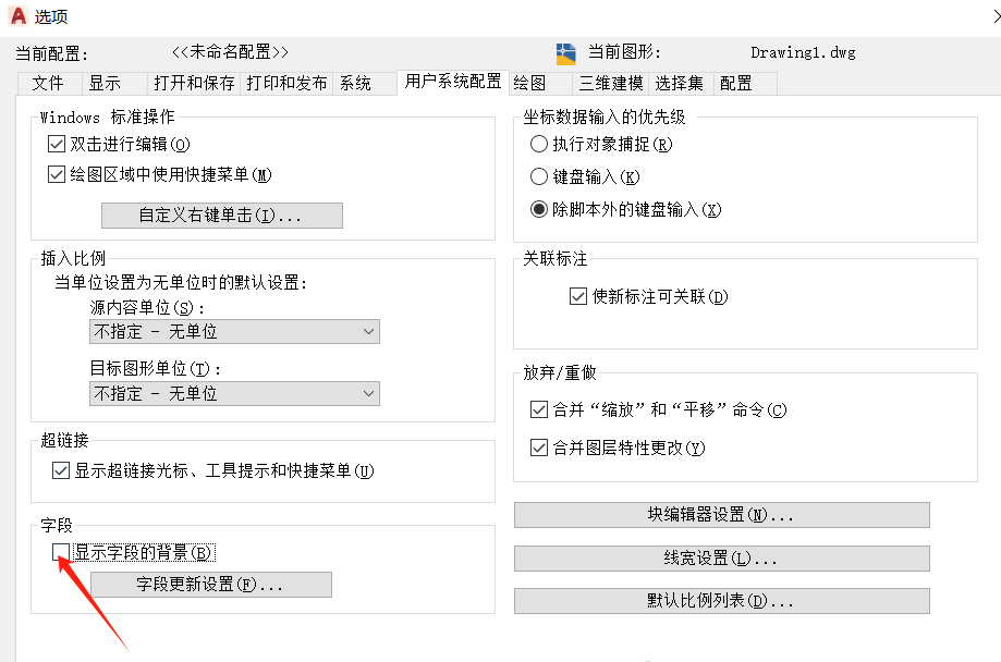 首先,输入"op",回车,弹出选项对话框,单击用户系统配置栏。