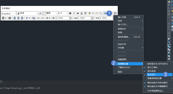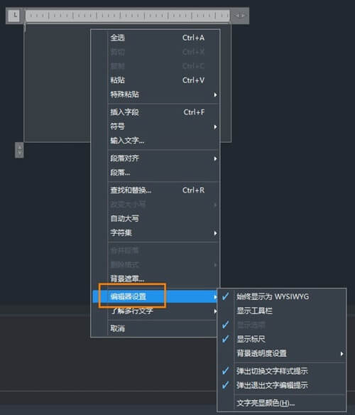 1.进入多行文字编辑,若工具栏还有,可以点击右边菜单扩展箭头,进入【编辑器设置】,勾选需要设置的对象。