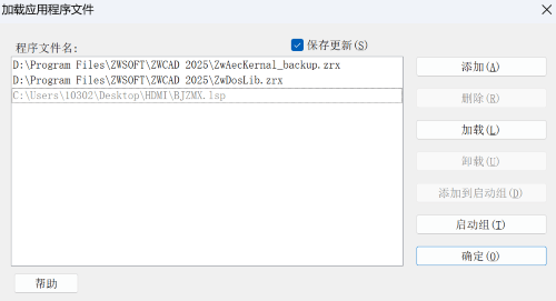 2、点击【添加】,加载BJZMX.lsp插件,点击添加到启动组;