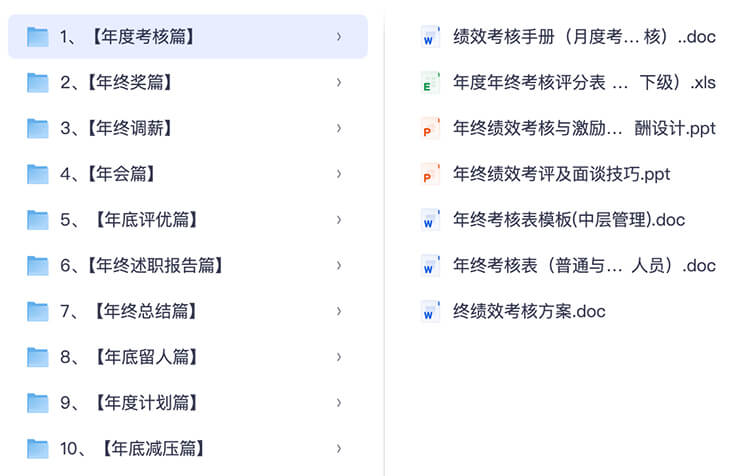 如果没有一套顺手的模板,光是整理文档、设计表格就能把人耗得筋疲力尽。为了帮大家高效搞定年底全流程,今天整理了最全年终工作神器合集,覆盖考核、薪酬、激励、总结、规划等全场景,Word、Excel、PPT 格式可直接编辑,不管是中小企业还是大型企业,都能无缝套用。