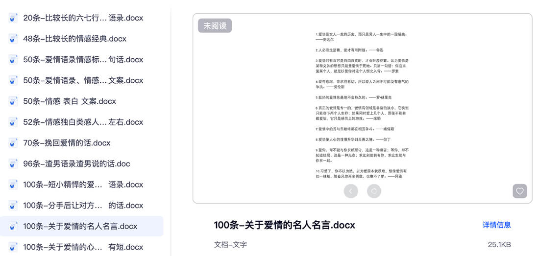 - 《100 条 - 关于爱情的名人名言.docx》:收录了鲁迅、罗素、萨特、阿桑等名家对爱情的深刻洞察,适合用于深度情感文、书评或视频旁白,瞬间提升格调。