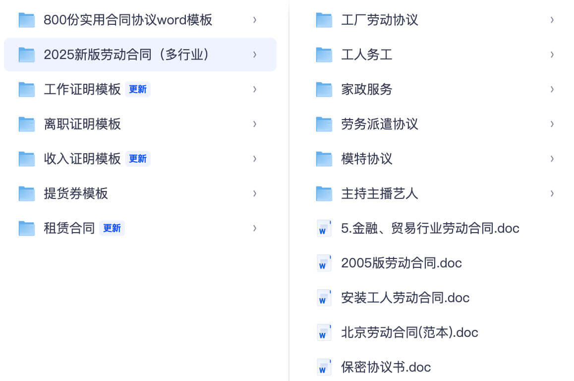 - 劳动用工类:2025 新版劳动合同(多行业),包含工厂劳动协议、工人务工、家政服务、劳务派遣协议、模特协议、主持主播艺人等细分行业模板,还有金融贸易、安装工人、北京地区等针对性范本,贴合最新劳动法规;