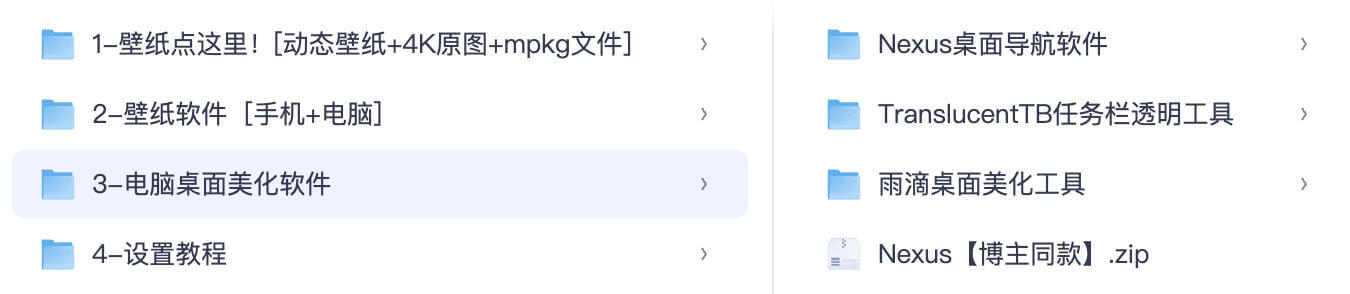 - 资源全面:壁纸覆盖静态与动态、手机与电脑,美化软件包含主流工具,一套就能满足桌面改造全需求;