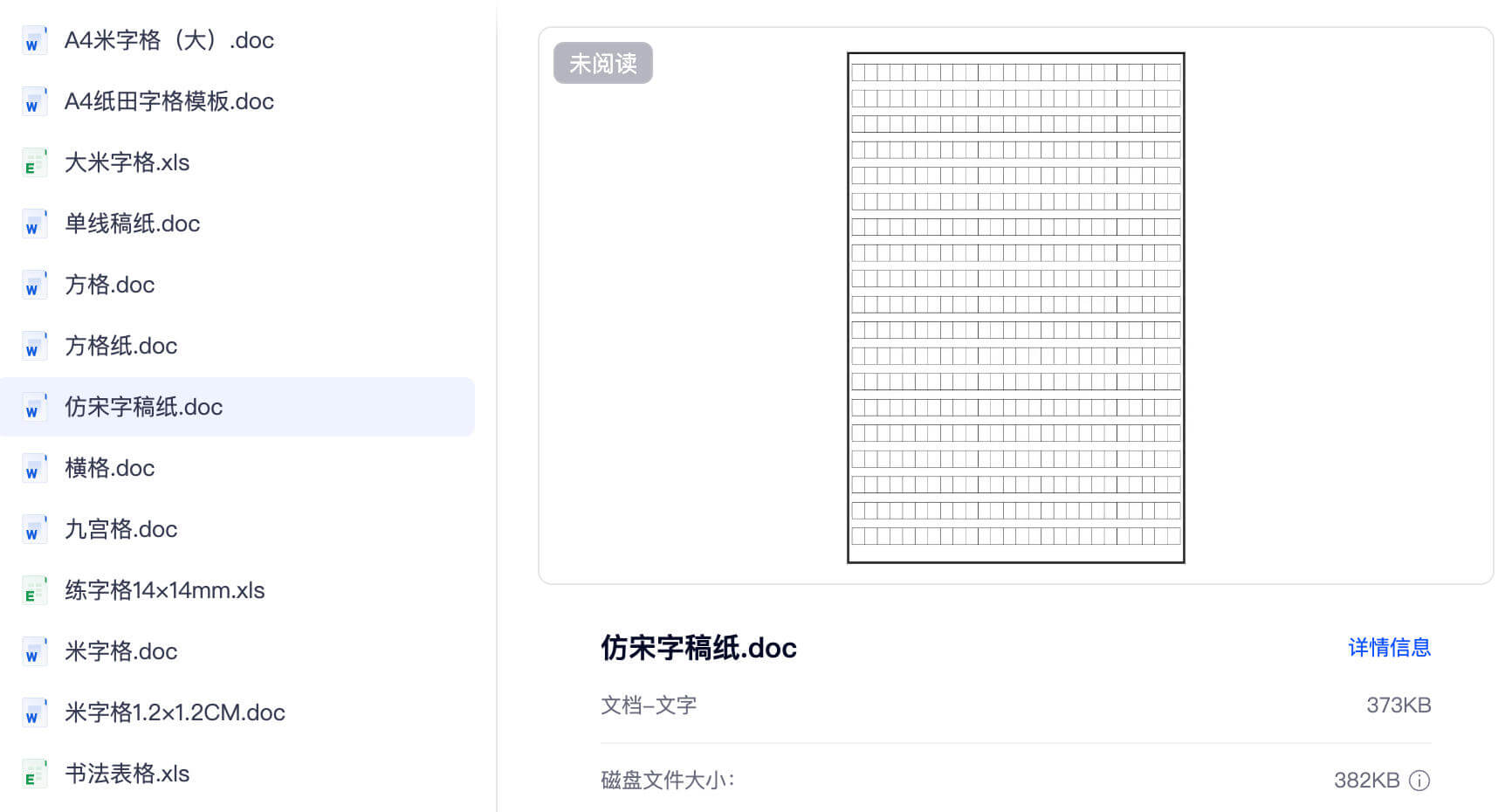 - 方格纸:《方格.doc》《方格纸.doc》《仿宋字稿纸.doc》,适合抄写课文、练习行书,也可用于硬笔书法创作;
