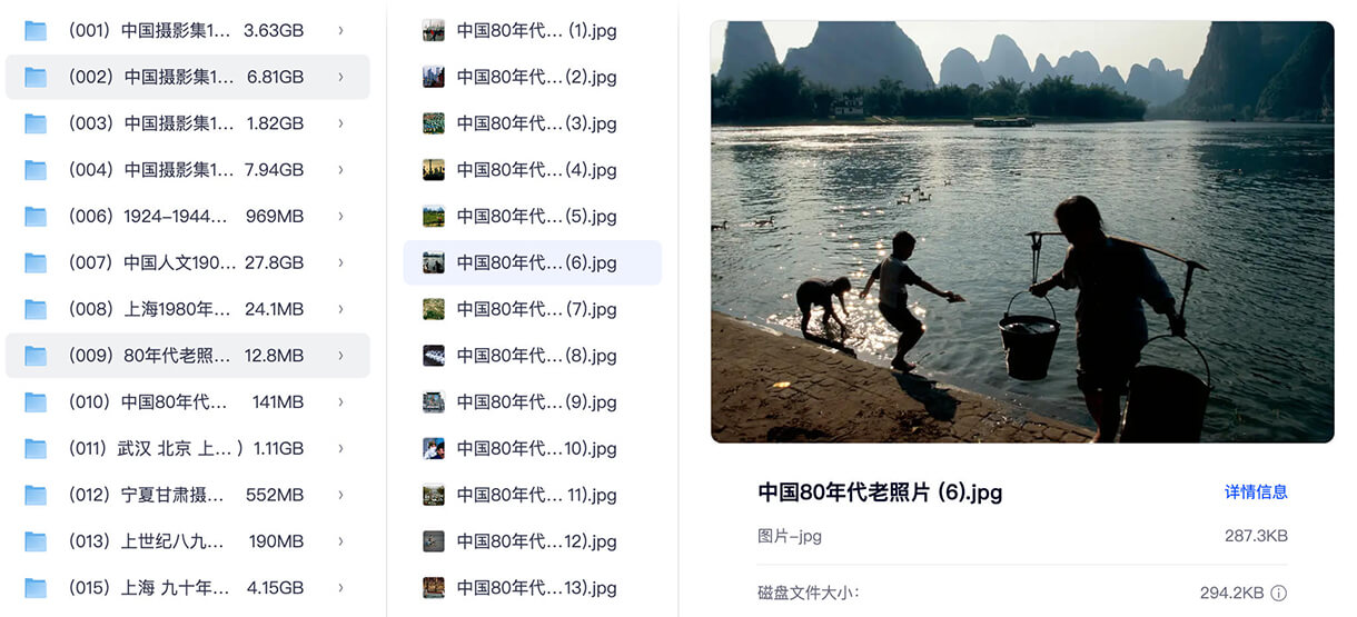 - 中国 80 年代老照片合集:覆盖全国多地的市井生活、自然风光、城乡变迁,如桂林山水间的劳作场景、上海的城市街景等;