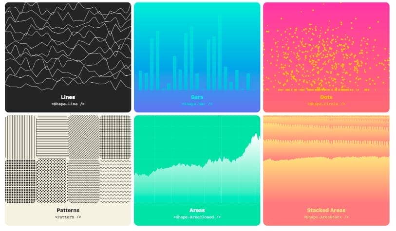 npm install --save @visx/mock-data @visx/group @visx/shape @visx/scale本质上,Visx 是 Airbnb 开发的一系列基于 React 的数据可视化工具。 Visx 代表可视化组件而并非可视化库,是基元或组件的集合,可以将它们混合在一起以根据项目的要求创建自定义可视化库。