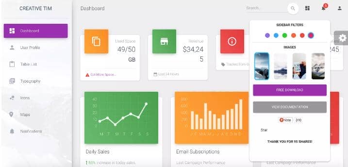 Material Dashboard 合理利用光线,总体布局类似于多张不同层次的纸张,有明显的深度感和顺序感。导航主要位于左侧栏,内容位于主面板的右侧。它是一个功能强大的 bootstrap admin dashboard ,可帮助构建管理面板、内容管理系统和 CRM 等产品。