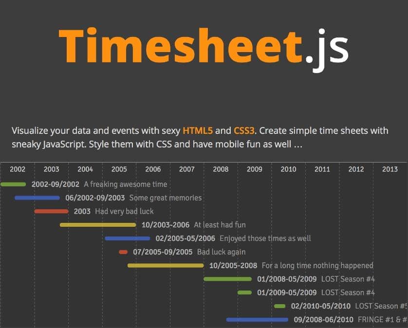 Timesheet.js 是通过 html5 和 css3 ,把数据和事件进行可视化处理的库。用 JavaScript 创建事件轴,用 CSS 美化样式,还有适合移动端的方法。