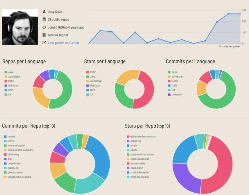 这是一个使用 Kotlin 和 JavaScript 开发的工具,用于将 GitHub 账号的档案可视化展示。其中用到了 Javalin 和 chart.js 这两个开源项目。