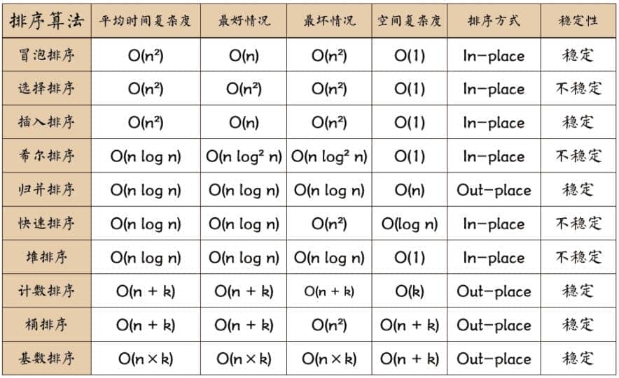 排序算法可以分为内部排序和外部排序,内部排序是数据记录在内存中进行排序,而外部排序是因排序的数据很大,一次不能容纳全部的排序记录,在排序过程中需要访问外存。常见的内部排序算法有:插入排序、希尔排序、选择排序、冒泡排序、归并排序、快速排序、堆排序、基数排序等。用一张图概括: