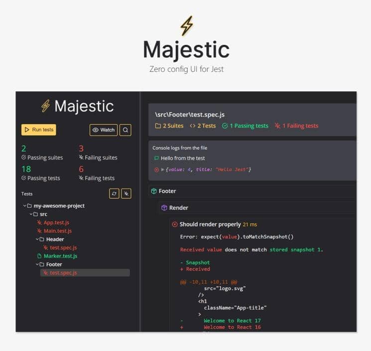 Majestic是一款用Jest运行测试的electron程序。 Majestic是一个工具,当您使用Jest编写测试时,为您提供出色的开发人员体验。