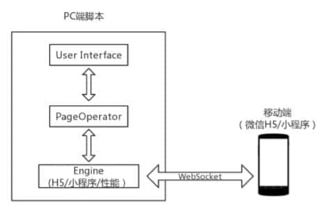 Engine( H5&小程序引擎层): 将用户命令传输到手机,并返回结果信息。封装 WebSocket 和单线程池,通过WebSocket Debug URL 和浏览器内核建立链接,发送 Json 格式的协议到手机端进行用户指定的操作。