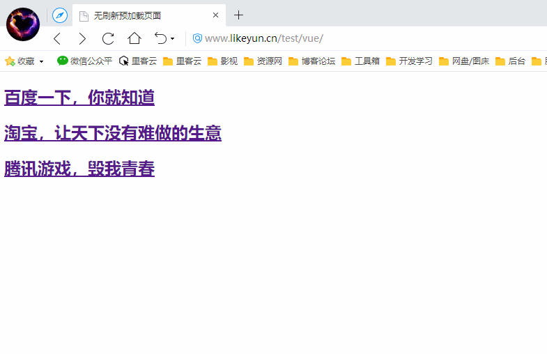 上面是我的演示,当点击a标签的时候,跳转到一个页面,我们可以看到,浏览器是没有刷新页面的,而是直接更改了浏览器url,全程没有刷新的动作,但是内容已经是另一个页面了。