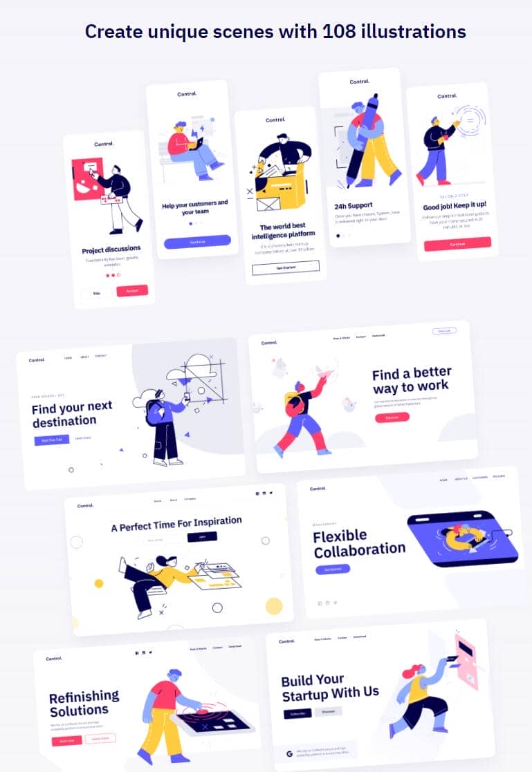 Control免费提供实心和线性风格的高质量插图。它们可自由用于商业和个人用途,但.png格式多样。免费版的图片素材为 PNG 格式图片,如果你需要其他格式的素材,可以获取他们的高级软件包,其中包含针对 Sketch、Figma 以及 AI 格式的兼容,并且附带 9 个动画。