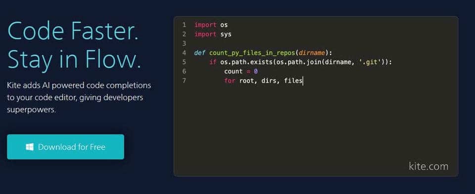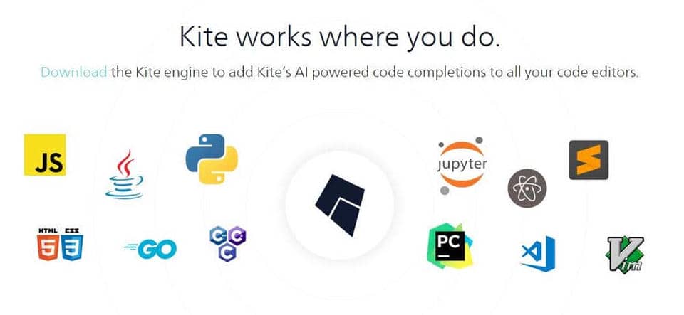 Kite对于提高你的代码生产力非常了不起。我相信,将来人工智能将不会接替我们的工作,但它将通过诸如此类的工具得到增强。它使用经过2百万个存储库训练的机器学习,在你喜欢的编辑器中提供自动补全功能。它目前仅适用于Python和Javascript,但不久之后将提供更多语言。