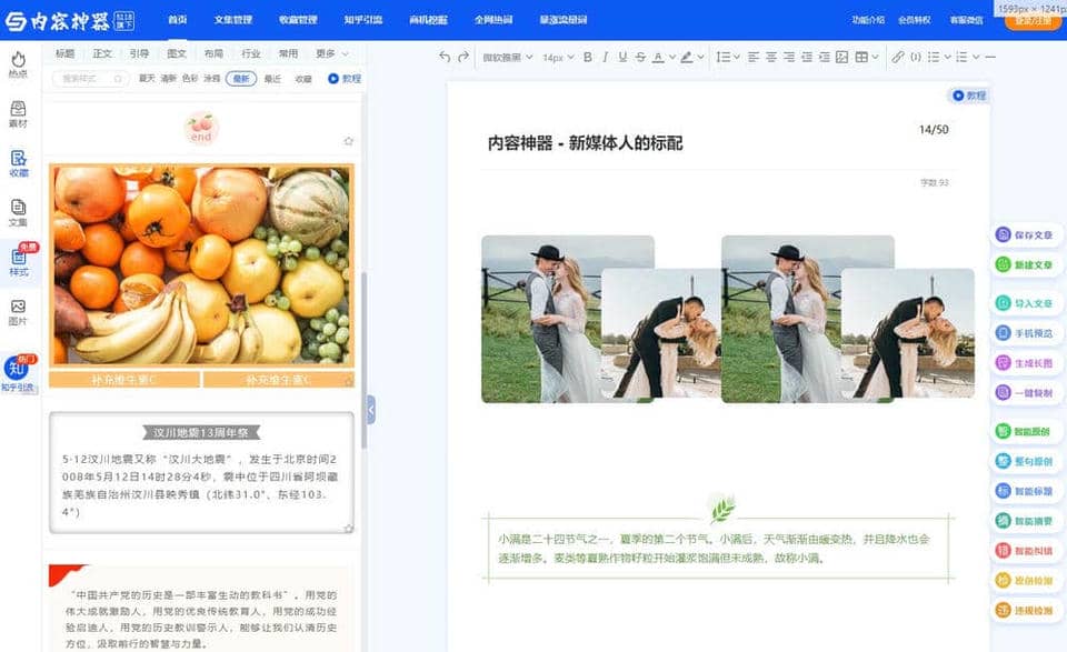 当中备受追捧的智能编辑器,大数据热点分析判断哪些热点值得追,自动找素材提高创作灵感,样式排版让公众号文章更美观,最为青睐的各项AI功能智能检测,不仅提高收录率,让文章更有保障。