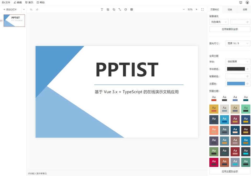 一个基于 vue3.x + TypeScript 的在线演示文稿(幻灯片)应用,还原了大部分 Office PowerPoint 常用功能,支持 文字、图片、形状、线条、图表、表格 6种最常用的元素类型,每一种元素都拥有高度可编辑能力,同时支持丰富的快捷键和右键菜单,尽可能还原本地桌面应用的使用体验。