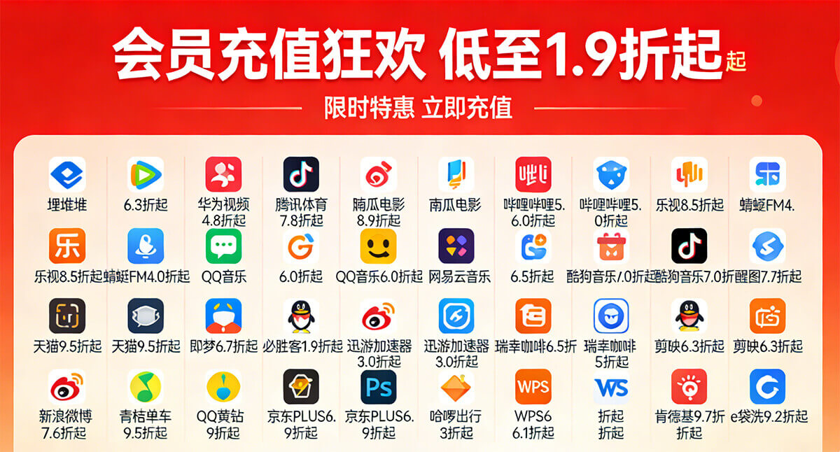 还在原价充会员?现在来我们的会员充值中心,30 多种会员权益都有优惠,最低 1.9 折就能充值,覆盖影视、音乐、生活等多个方面,正品保障,充值后极速到账。