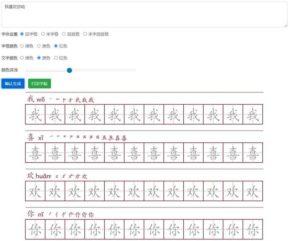 字帖生成器 分享 复制链接 新浪微博 QQ 好友 扫一扫分享 点击使用 这是一款在线字帖生成器(含四线三格拼音版),支持田字格、米字格、回宫格的拼音字帖生成,生成结果支持背景、拼音、笔顺、颜色等设置,作为一款练字神器当然也支持打印输出哦。如果需要存背景打印,只需选择颜色深浅值为0即可。效果如下:‘’马上使用,点击进入链接: https://fly63.com/tool/detial/107