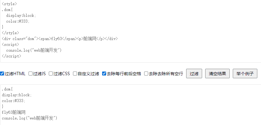 在线html标签过滤工具 分享 复制链接 新浪微博 QQ 好友 扫一扫分享 点击使用 本工具可以清理html代码中所有的标签,包含js和css标签等,能将html代码过滤成单纯的文本,该工具还可以对指定字符进行替换。如下所示:通过删除HTML代码中不需要的标签和空格而不更改内容显示来优化您的网页。现在试试!马上使用,点击进入链接: https://fly63.com/tool/detial/132