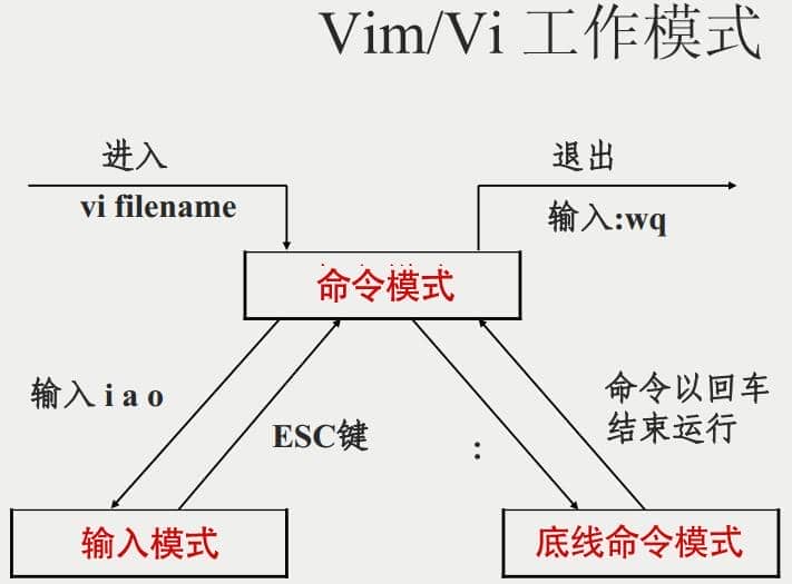 基本上 vi/vim 共分为三种模式,分别是命令模式(Command mode),输入模式(Insert mode)和底线命令模式(Last line mode)。 这三种模式的作用分别是: